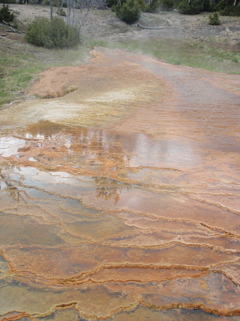 Rain! As predicted, so I hopped in the car and got around a little. Saw the east end of the park, some more bisons and "Mammoth Hot Springs". A ranger told me that normally all the fields are covered with water. Today, only some little terraces where flooded, but they looked really nice and colorful.